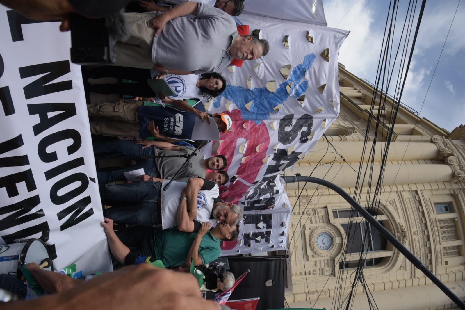 Como integrantes de la CGT y junto a la CTA participamos del abrazo al Banco Nación por el patrimonio, los derechos, los clubes, los medicamentos, los alquileres, la comida, la democracia y 366 razones más. NO AL DNU!