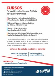 En el marco de los cambios tecnológicos y la transformación digital que atraviesa el mundo laboral y la gestión del Estado, UPCN Santa Fe presentó una nueva oferta de cursos de formación en Inteligencia Artificial orientados al sector público.